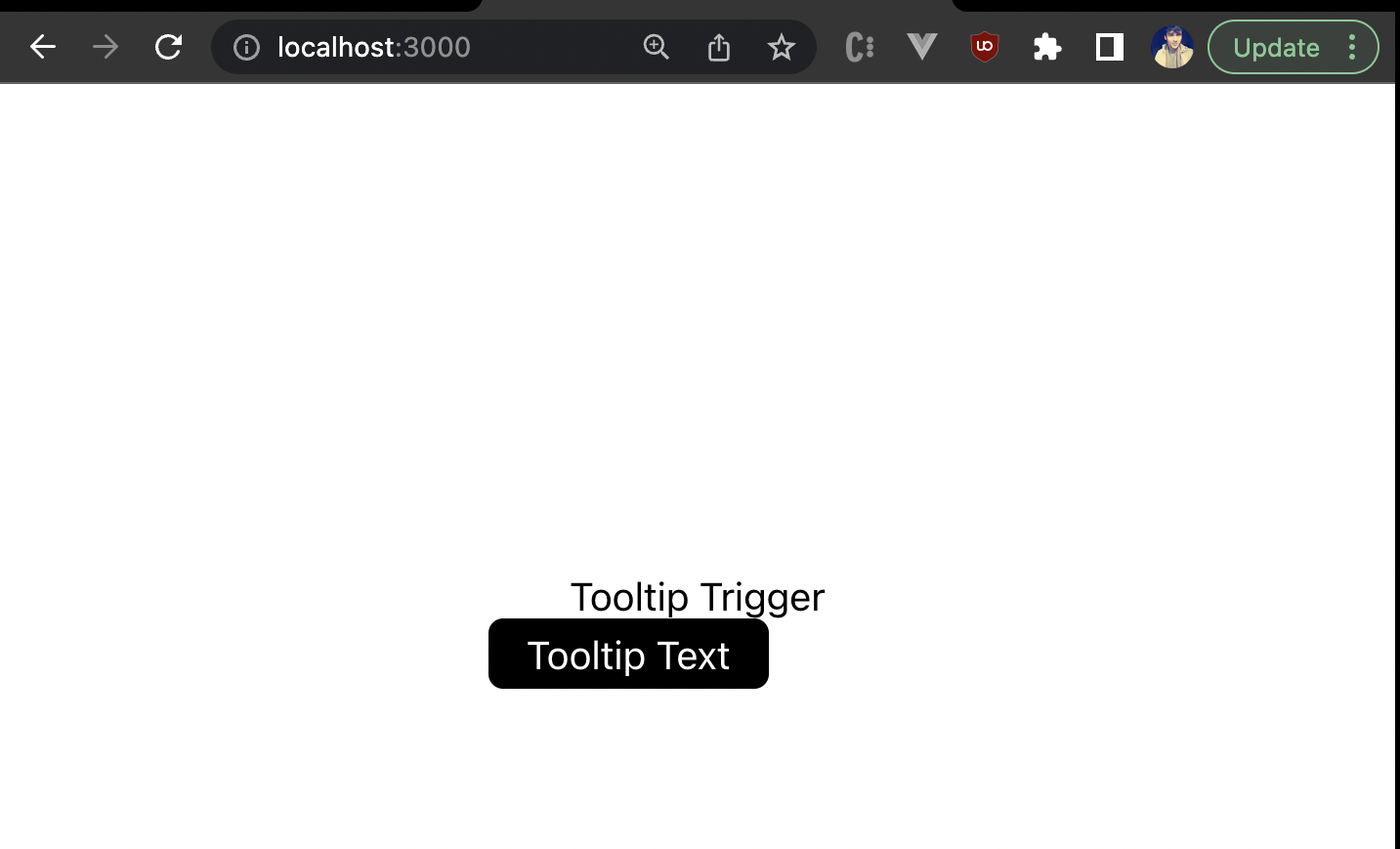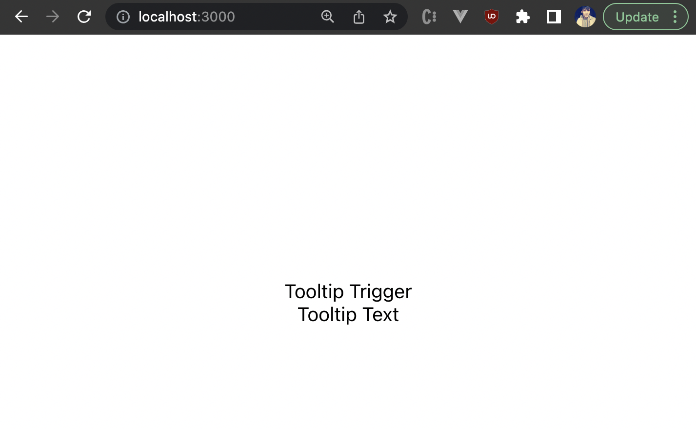 Once you remove your mouse from the trigger, the tooltip text should go away. These are the basics of how you can show and hide the tooltip on hover. But the tooltip doesn’t really look like a tooltip yet. So let’s go ahead and style it, and also understand how we can position it with respect to the trigger element.