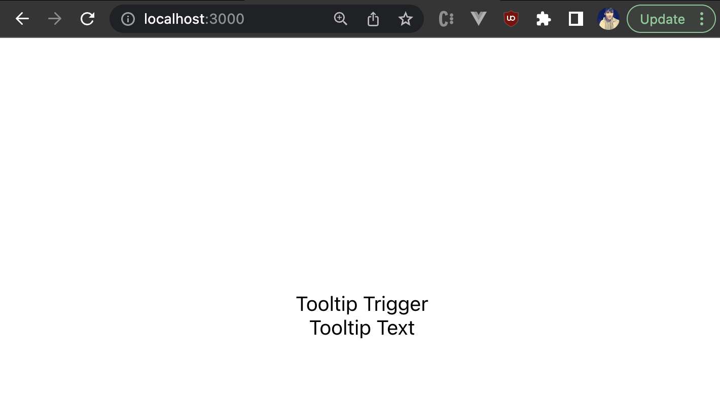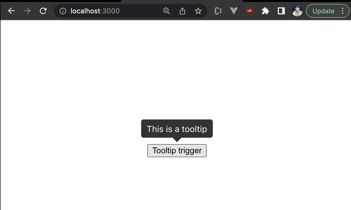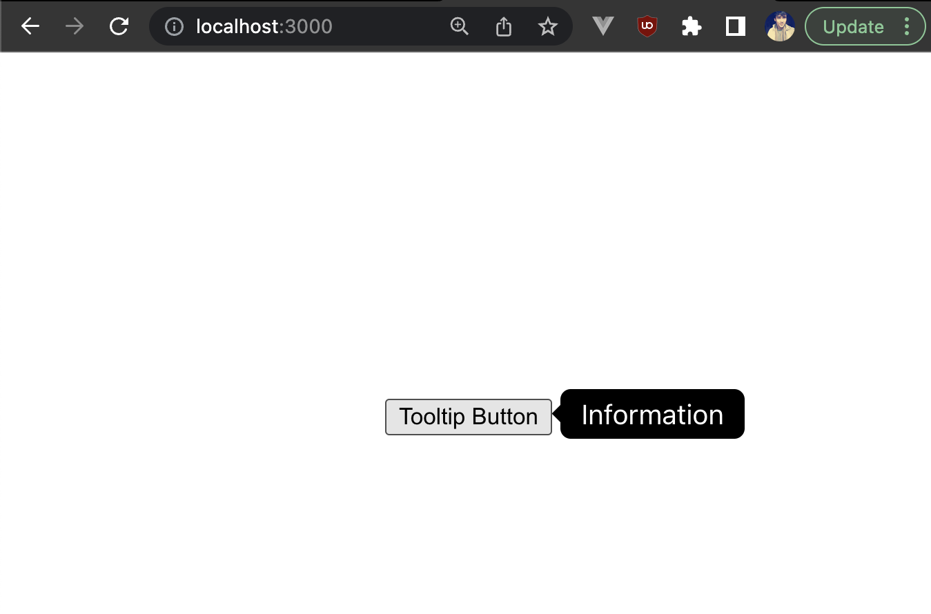Great! We’ve built our own custom and reusable tooltip component from scratch. However, there are still a lot of use cases for which this tooltip component will need additional props for customization, such as triggering the tooltip on a click, rendering some custom template against the hardcoded tooltip template, or modifying the colors of the tooltip.