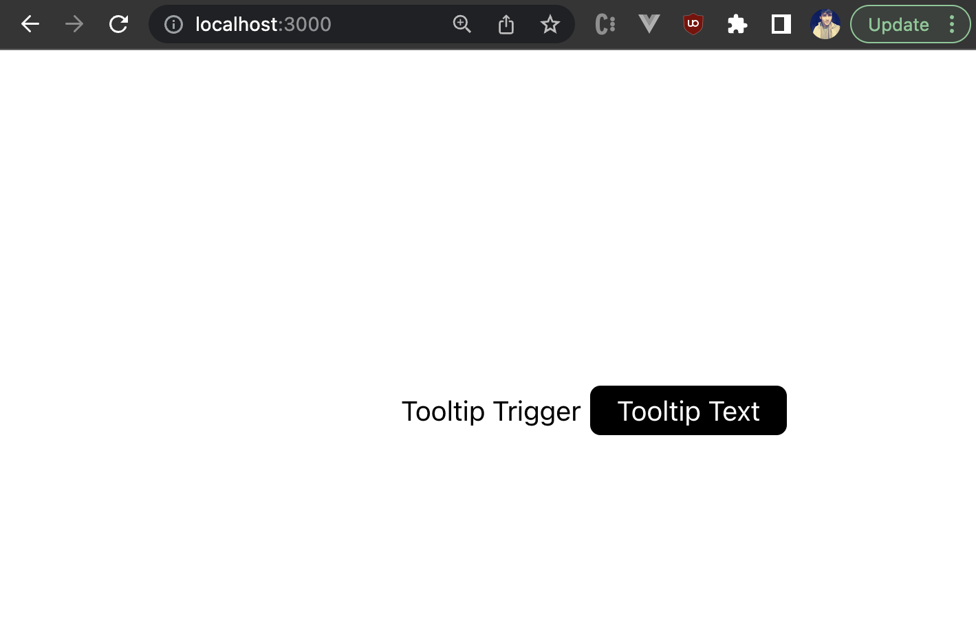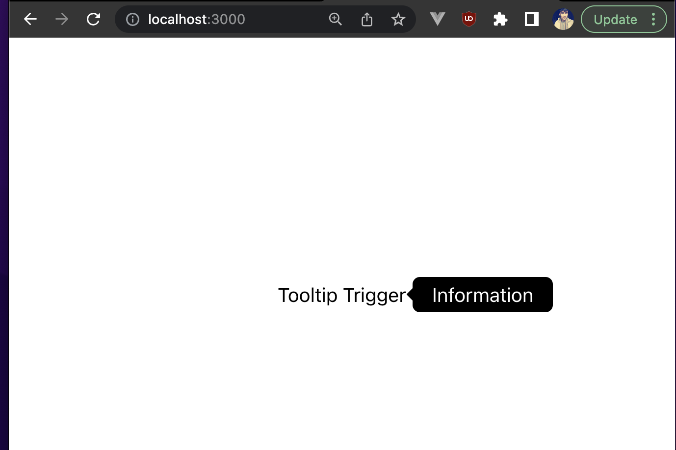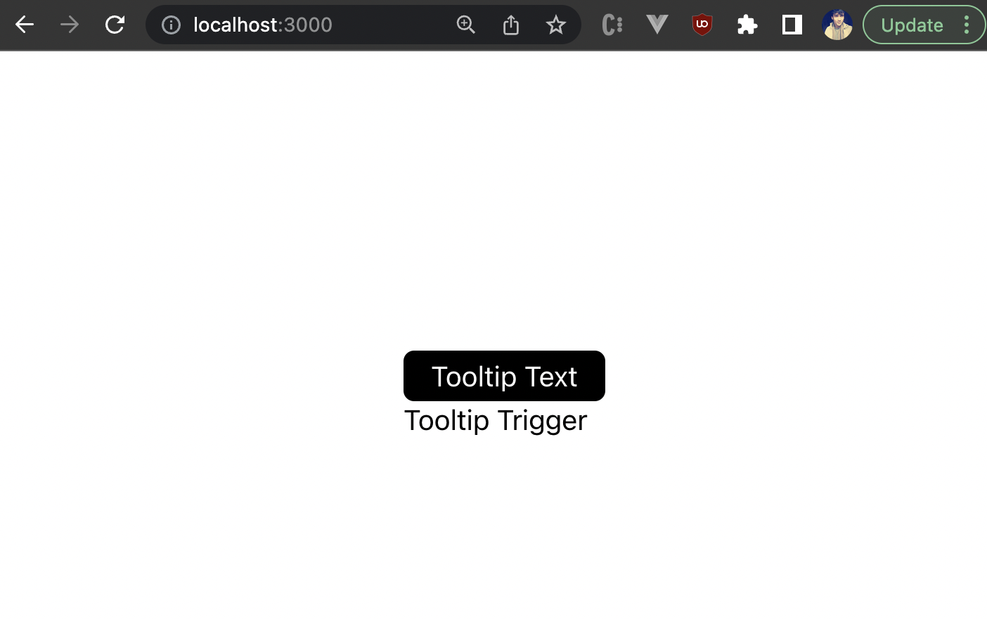 Great! We’ve built our own custom and reusable tooltip component from scratch. However, there are still a lot of use cases for which this tooltip component will need additional props for customization, such as triggering the tooltip on a click, rendering some custom template against the hardcoded tooltip template, or modifying the colors of the tooltip.
