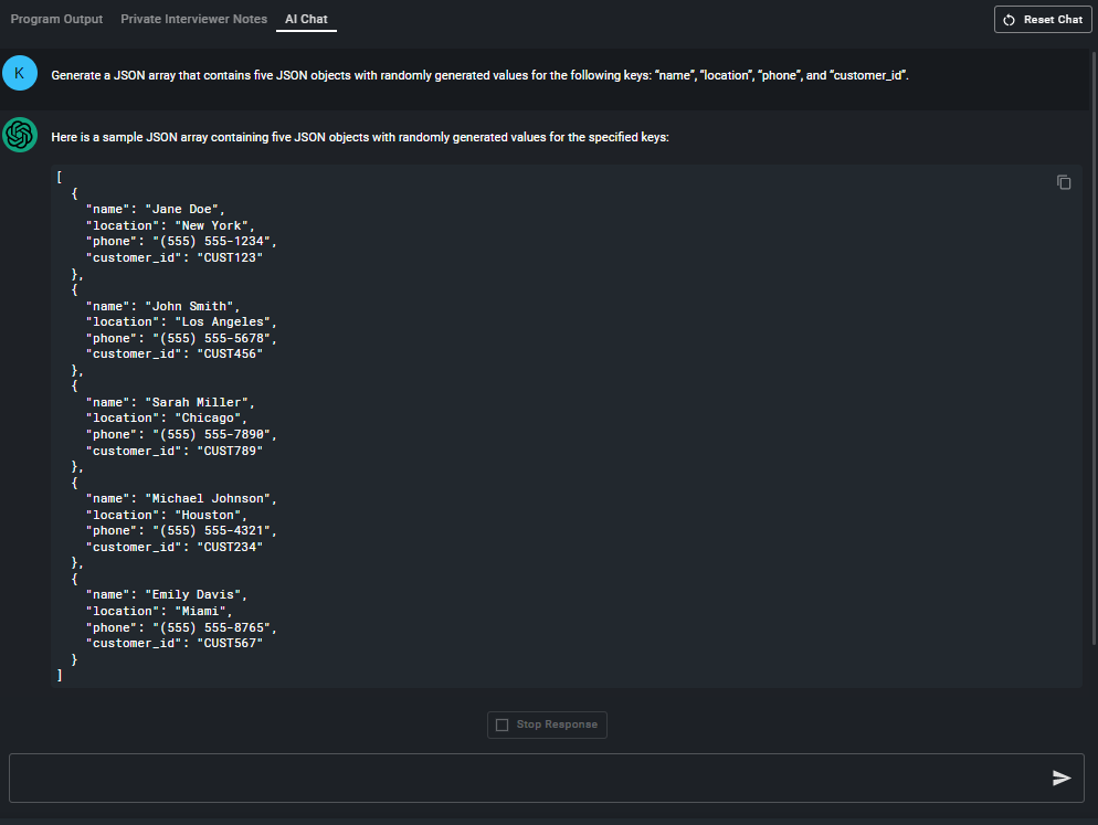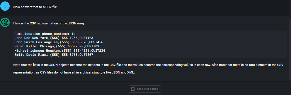 For example, say I need to mimic some customer data for an eCommerce application assessment. I’d write the following prompt to ChatGPT: