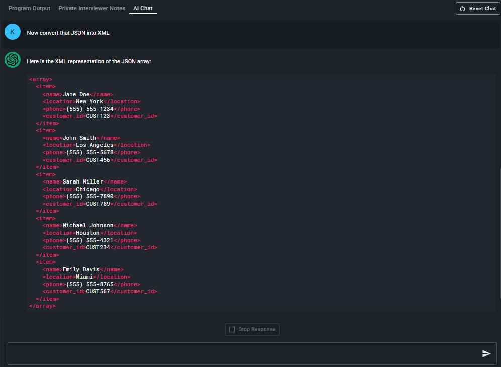 We created the CoderPad Interview ChatGPT integration to enable interviewers to observe how candidates critically approach problems and utilize modern toolsets. Many users of our ChatGPT integration use it as a collaboration tool during interviews with candidates. They present a question to the candidate and allow them to use the integration as they would Google or StackOverflow.