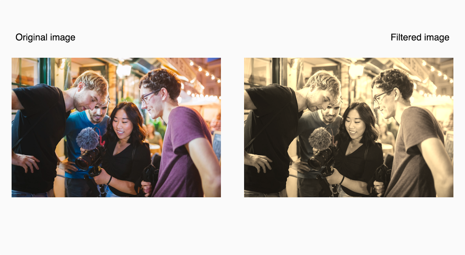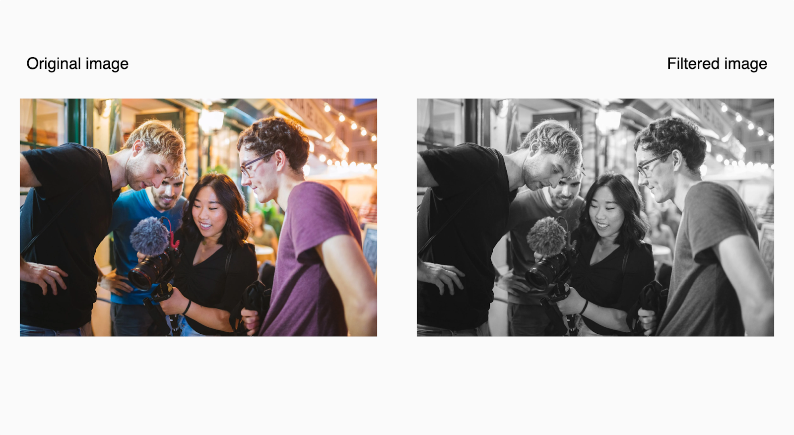 The grayscale filter removes all color information from an image and sets its color to a tone in the grayscale.