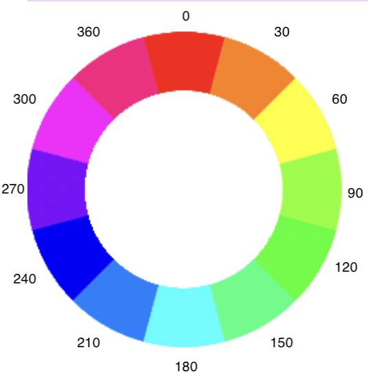 Each color in the color wheel has a property called hue, the position of the color (in angle degrees) on the wheel.