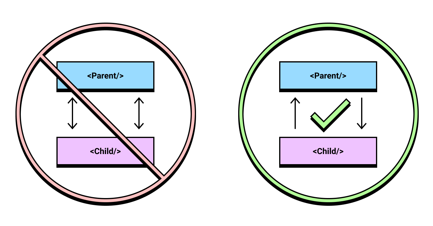 In order to explain how both of these look in real code, let’s start with how a properly unidirectional parent and child component would be written.