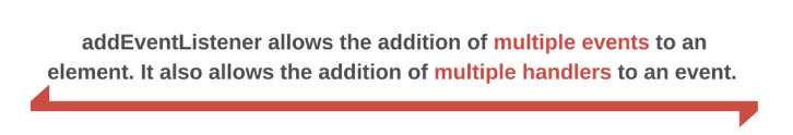 Additionally, addEventListener allows the addition of multiple events to an element. It also allows the addition of multiple handlers to an event. It works well with libraries and JavaScript modules.