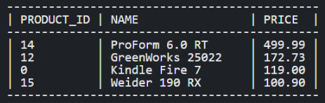 Output exactly the PRODUCT_ID, NAME, and PRICE columns as in the example below.