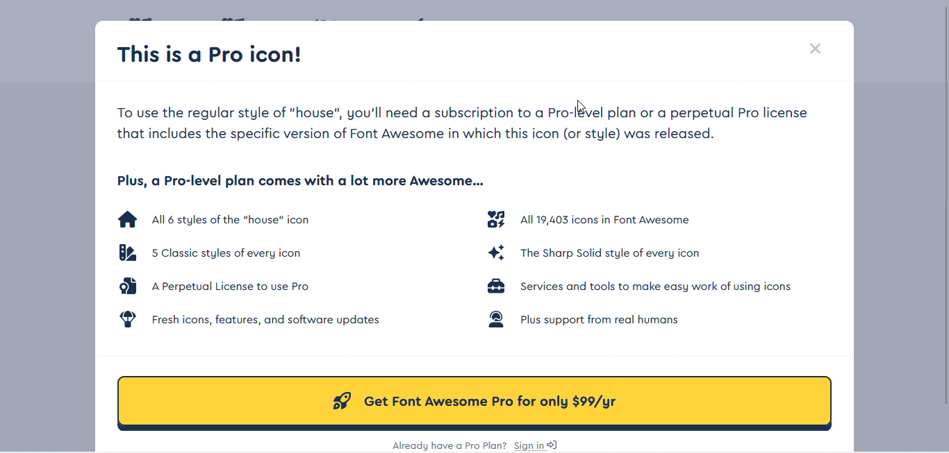 ℹ️ It’s important to note that a lot of the icons and some features available on Font Awesome are not free, and they’re only accessible when you have a pro account.