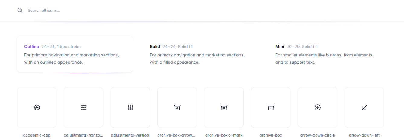 Heroicons also comes in three different styles corresponding to different icon use cases:
