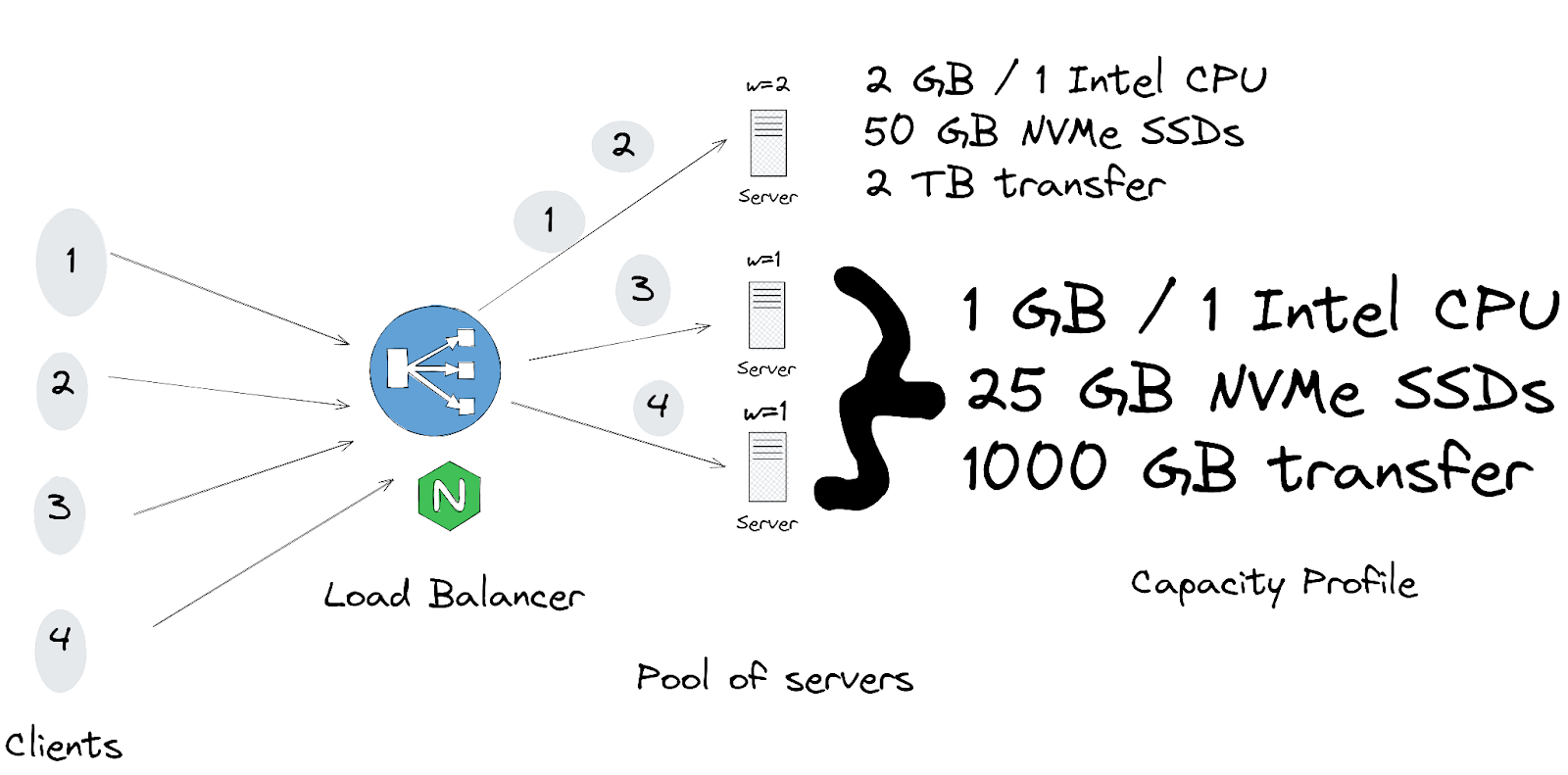 With this configuration, the first server will process 4 times the requests that will be processed by the third server and 2 times the requests that will be processed by the second server. The second server will process 2 times the request that will be processed by the third server