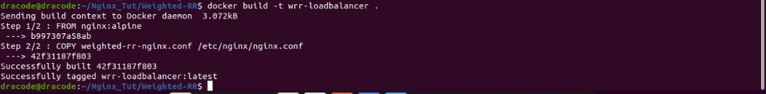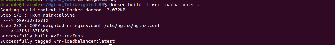 nginx image is built from the Dockerfile with the command docker build -t wrr-loadbalancer . Run a new container from the new Docker image you just created: