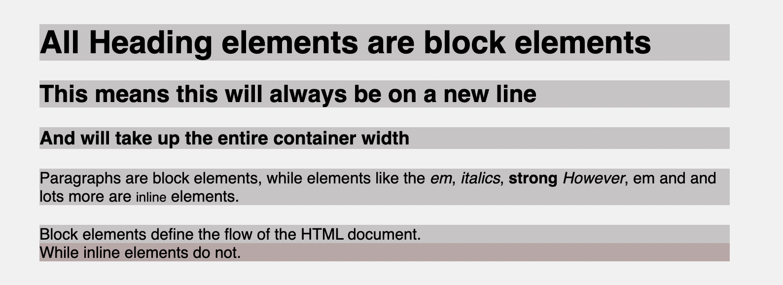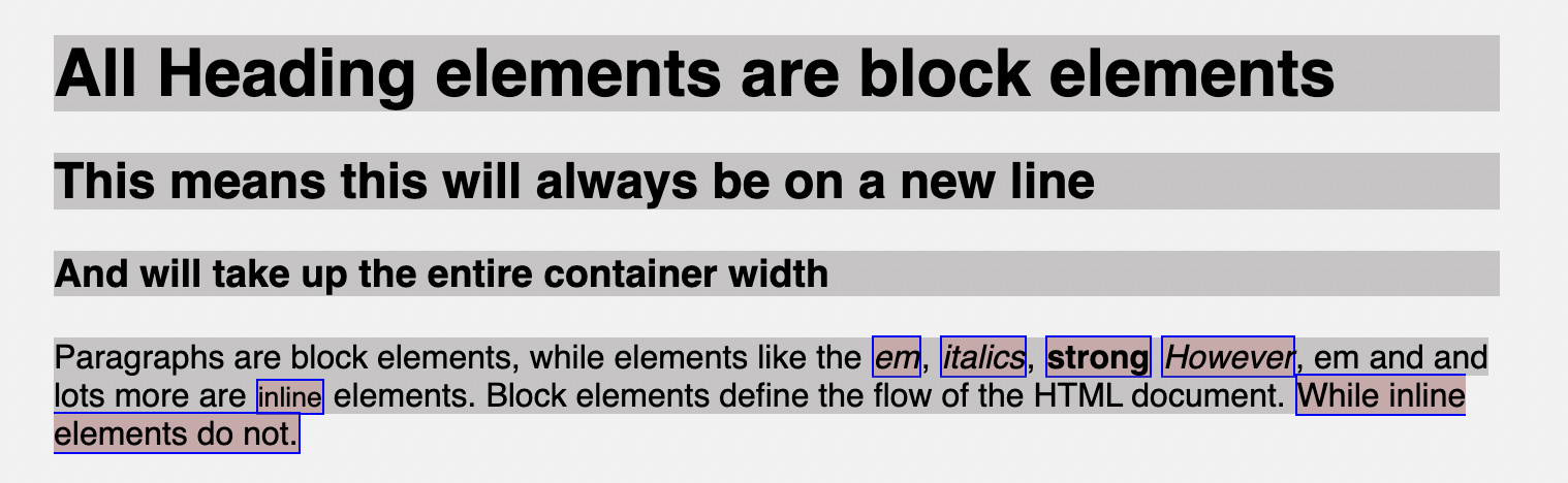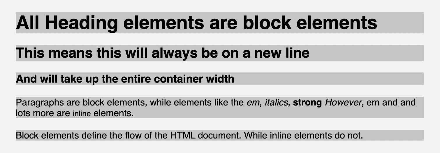 To illustrate the block elements, I will add background-color, so you notice how they fill up the entire width and move to new lines.
