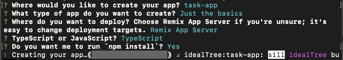 The command above will prompt you to choose the configurations for the project. First, you’ll call our app task-app, choose Just the basics, then the Remix App Server deploy target, use TypeScript, and have it run the installation for you.
