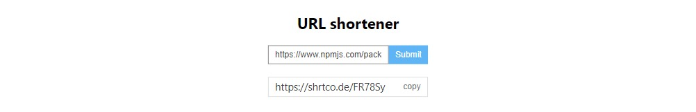 https://www.npmjs.com/pack shortened using Shrtcode’s API is returned beneath the input box.Copy shortened URL to the clipboard