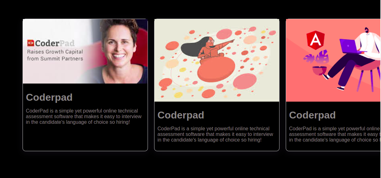 </p></div></div><divclass="card"><imgsrc="https://encrypted-tbn0.gstatic.com/images?q=tbn:ANd9GcTykw4RpJXpvKdG2mioMW0HfzNjXfGtzS_ojZ3adk_IBqp3xSbSVBIv0jJ2khhML_sZv5s&usqp=CAU"alt="" /><divclass="card__content"><h1>Coderpad</h1><p>