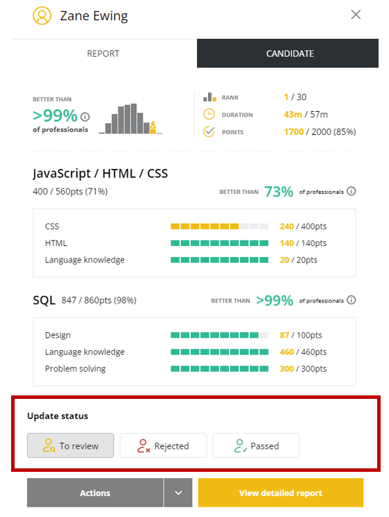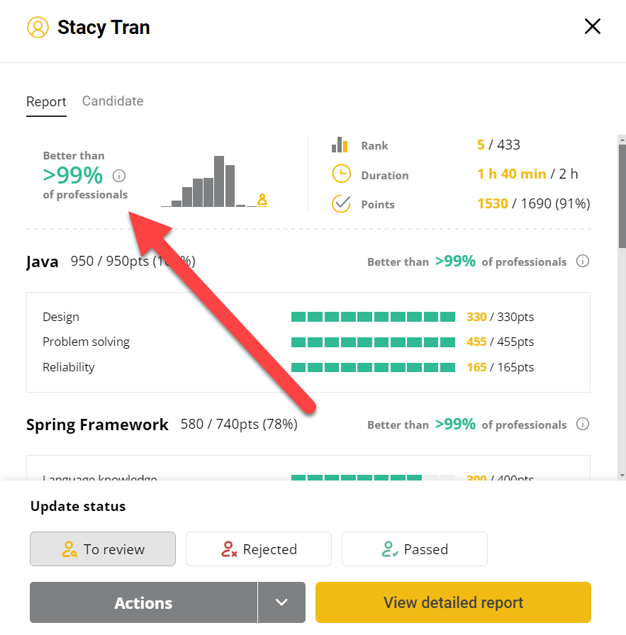 Click on a candidate’s name. A pop out on the right shows information on candidate score and ranking compared to other candidates tested on the same technology and at the same level.