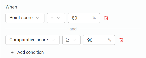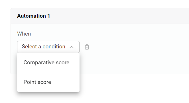 Once you select the score type you want to automate on, you’ll then select a conditional operator ( =, ≤, or , ≥`) and set the score threshold for when the rule will trigger.