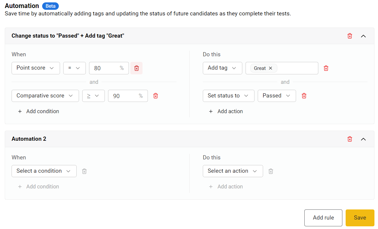 If you want to streamline your hiring process you can create rules to automatically pass, fail, or tag candidates based on their test scores. You can set up these rules either for individual tests by navigating to the Test Settings for each test, or as default rules for all your tests by navigating to the Test Settings for your account.