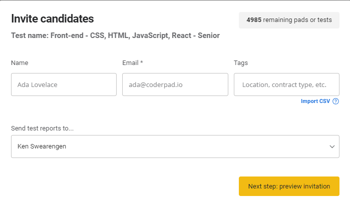 Input the candidate’s first name, last name, and email address. You can also import a .CSV file with multiple candidates.
