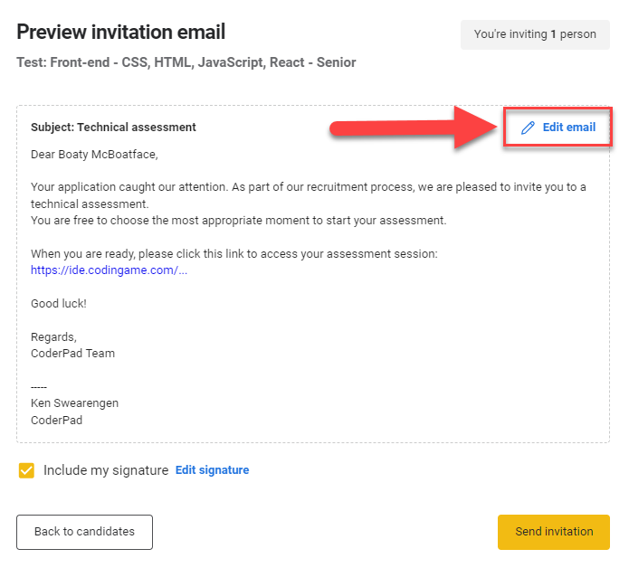 In the Preview invitation email window, click Edit email to customize the test invitation.