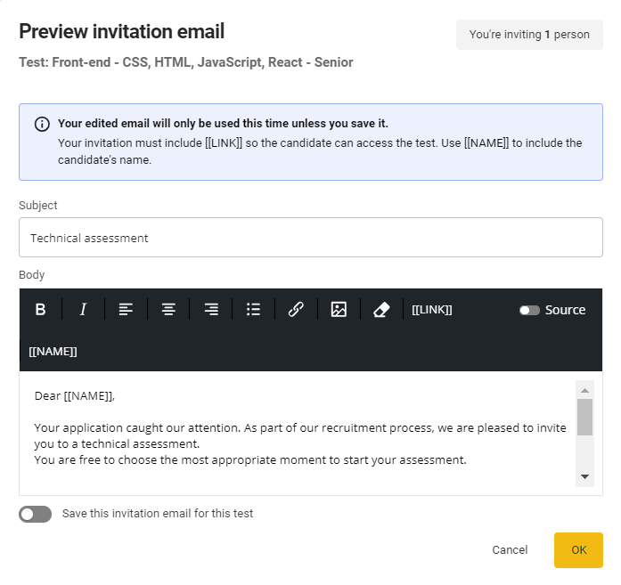⚠️ The system inserts the candidate’s name at the [[NAME]] tag, and the invitation link at the [[LINK]] tag. Do not remove these tags.