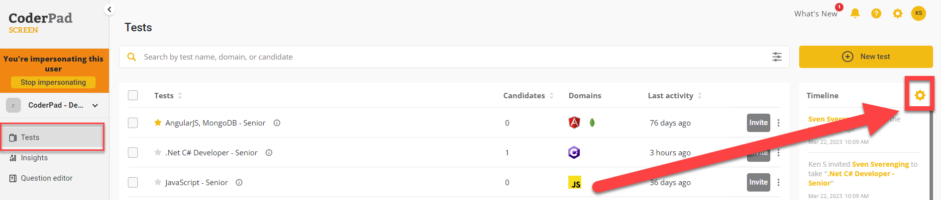 To access the Timeline settings, navigate to your account and click on Tests on the left navigation menu. Then, click the gear wheel icon ⚙️ in the top right of the Timeline window.