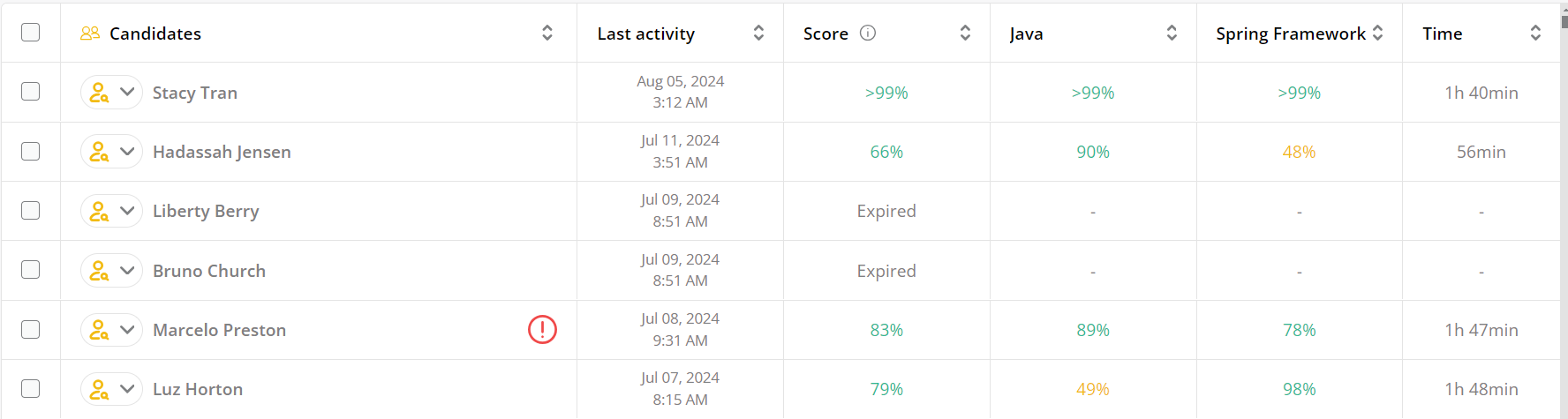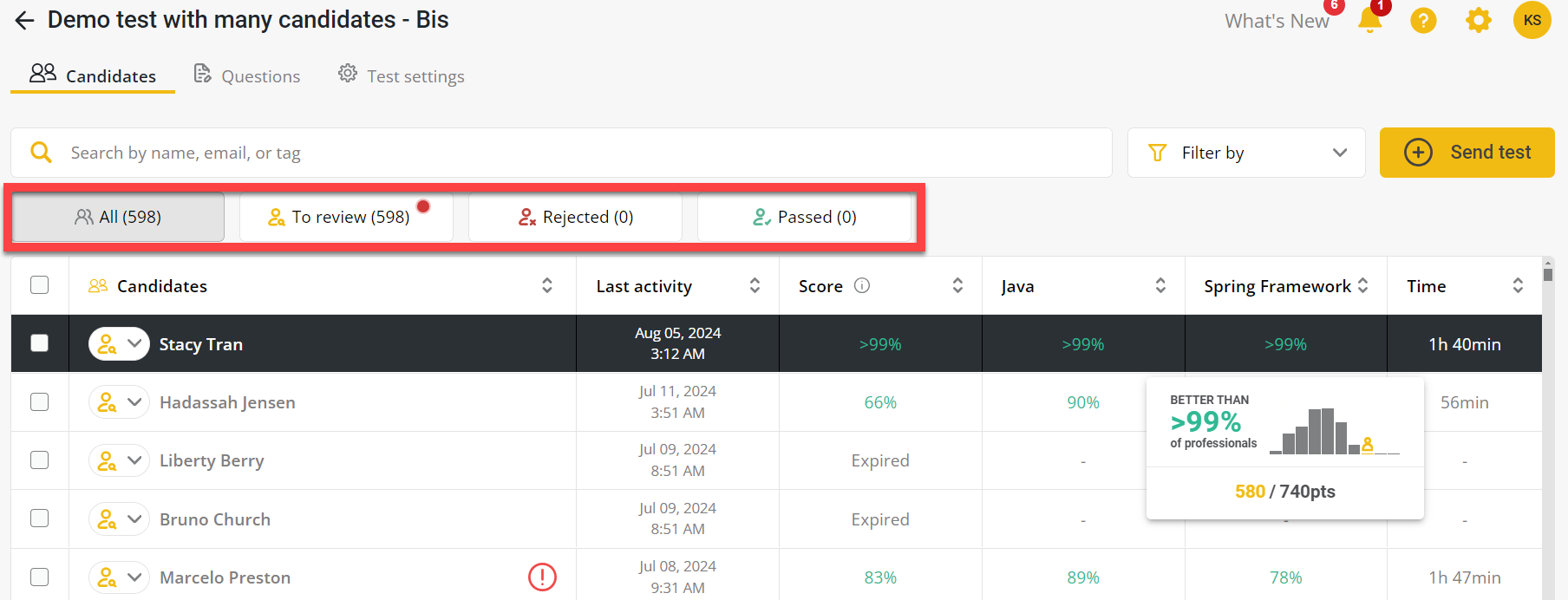 By default, candidates are sorted by their global test score. If you test them on several technologies, there is a score per technology.