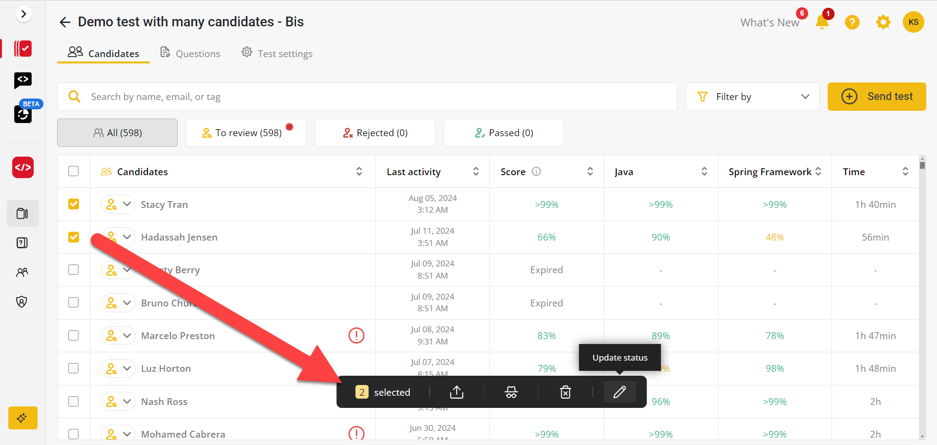 3. Select several candidates, open the batch action drop-down menu, then click on Update status: