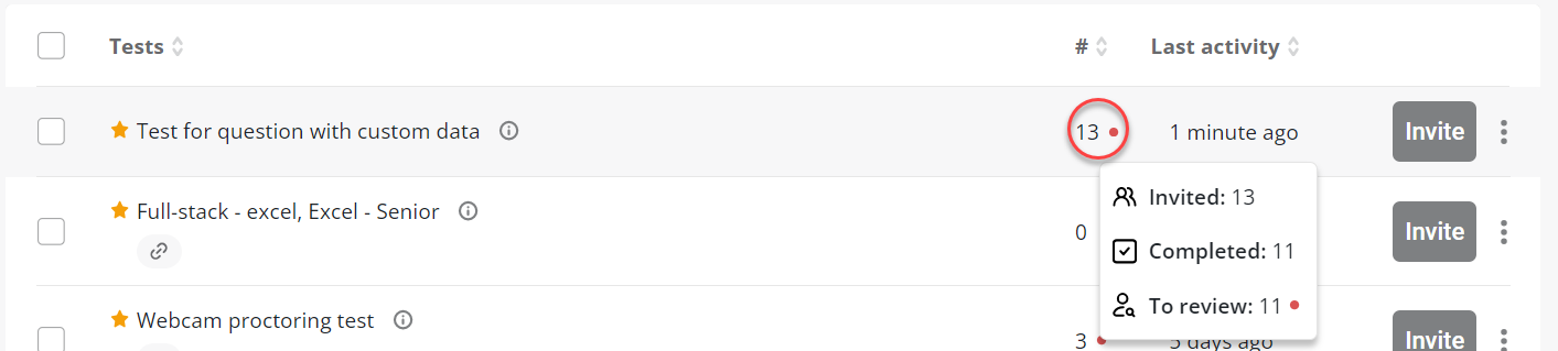 Hover over the # for a particular test to see the number of invitations, the number of completed tests, and the number of tests needing review. If the Invited and To review numbers are the same, there are no pending tests. If the numbers are different, there are pending tests.