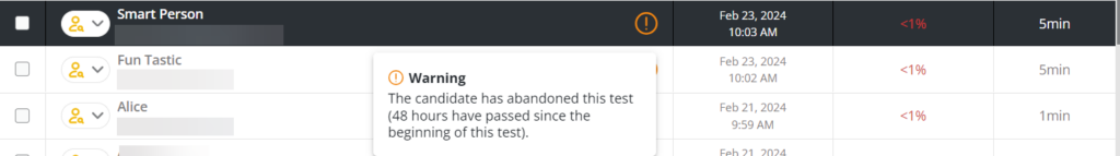 - If the candidate started the test but stopped while taking it, they have 48 hours to finish it. If they do not finish it within the 48 hours window, the score is based on completed questions and a red exclamation mark notifies you that that test was abandoned by the candidate.