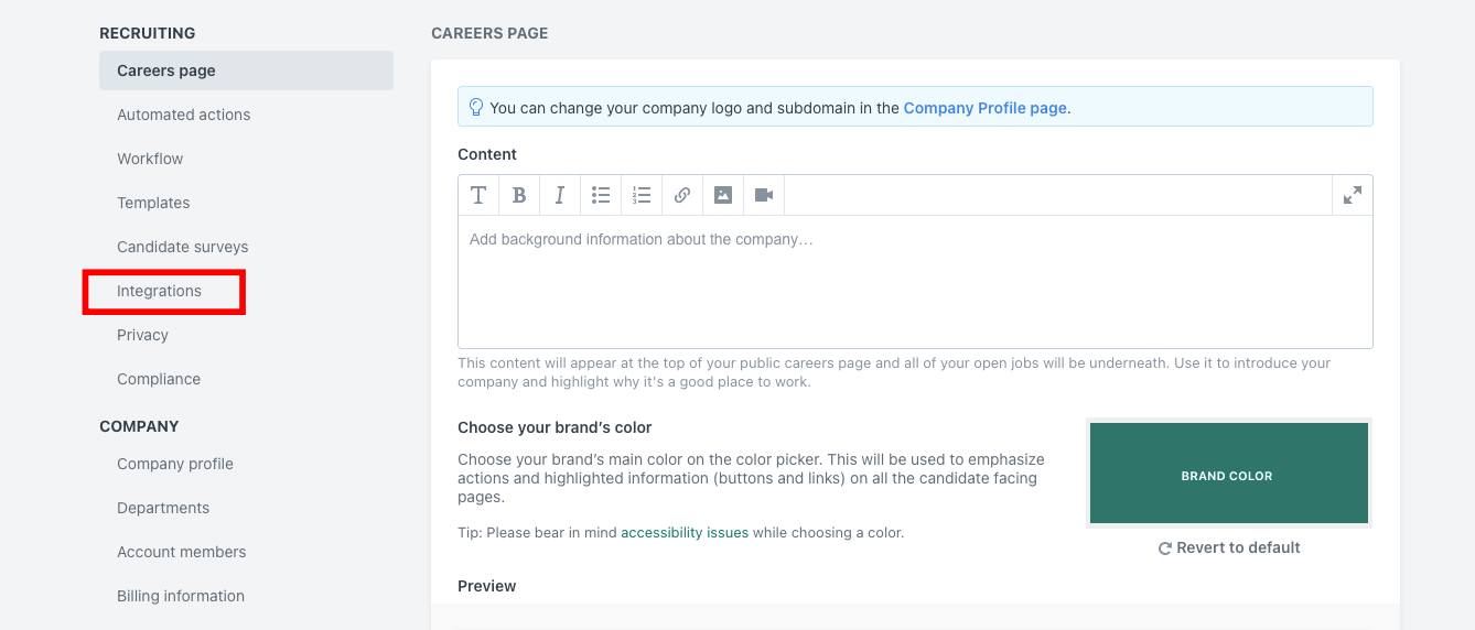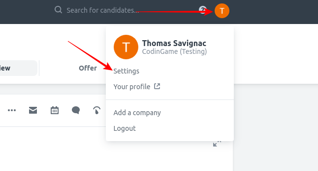 2. Log into your Workable account. In the top menu, on the left, click on your profile and then on Settings.