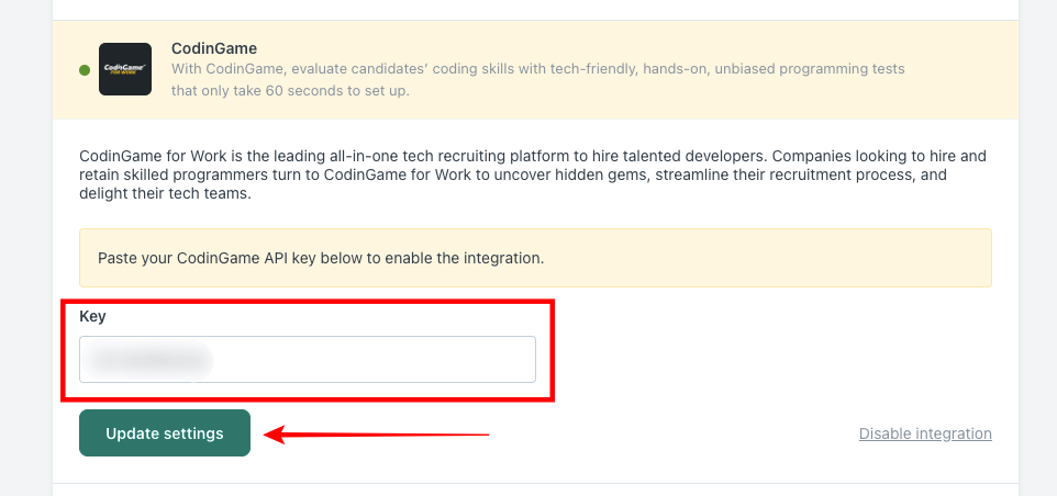 5. Paste your Workable key in the dedicated field and click on Update settings.