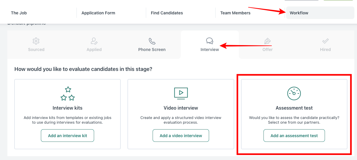 7. Once your new job is ready, click on the Workflow tab and then on Interview > Add an assessment test to add your Screen test.