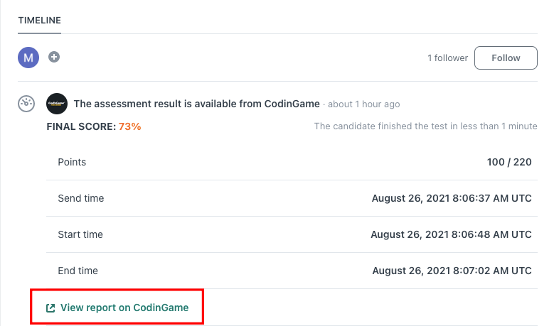 If you wish to see the detailed results report, simply click on the View report on CodinGame link. You’ll need to log in to your company’s Screen account to see the full report.