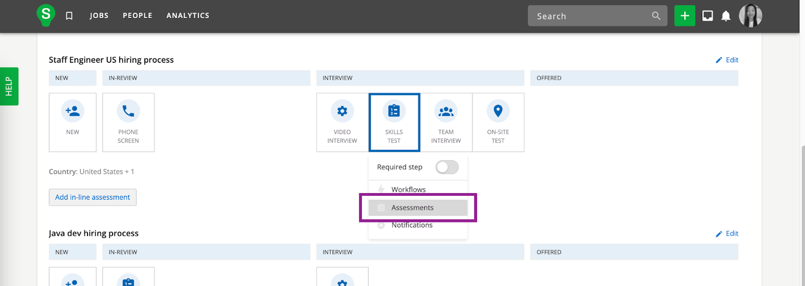Once you have configured the hiring process – as described in the set up instructions – and a candidate has moved into the Skills Test stage for a job, an Interview link is automatically generated in the Assessments section of the SmartRecruit dashboard.