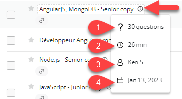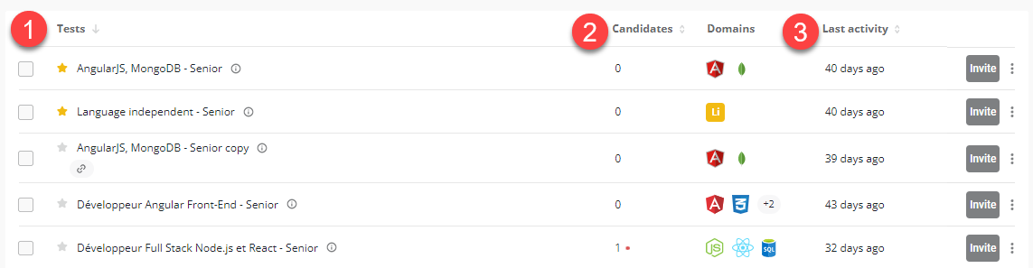 You can easily sort tests alphabetically by the test name (1), by the number of invited candidates (2), or by the time of last activity (3).