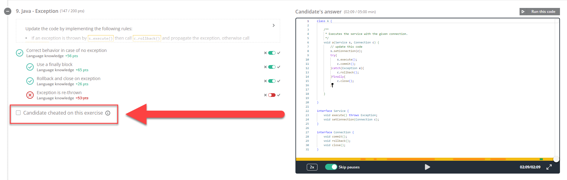 If you’ve made the determination that a candidate has cheated on a particular question, you can mark that by selecting the Candidate cheated on this exercise checkbox on the offending question.