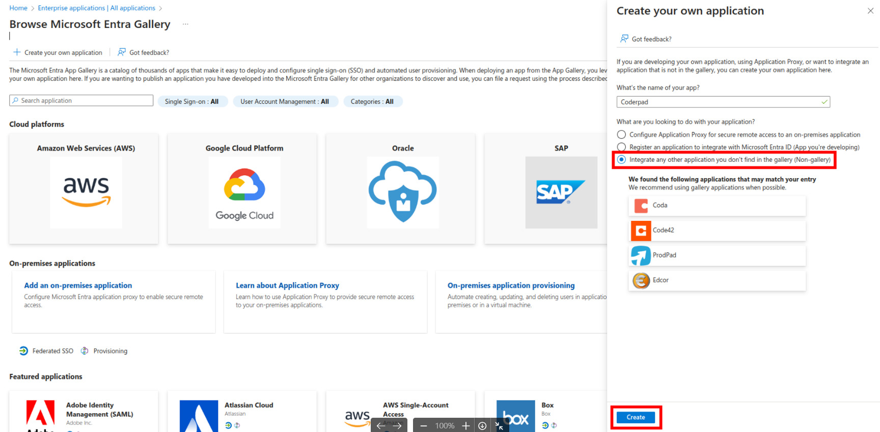 2. Enter Coderpad as the name of your app, select the Integrate any other application you don’t find in the gallery (Non-gallery) option, and click Create.