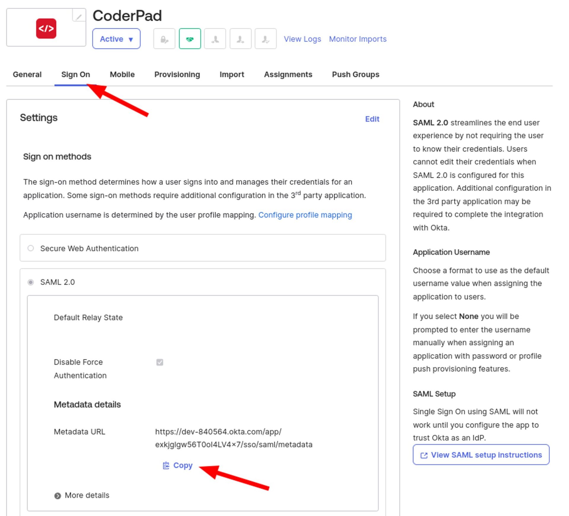 7. Go to the Sign On tab, and copy the Metadata URL.
