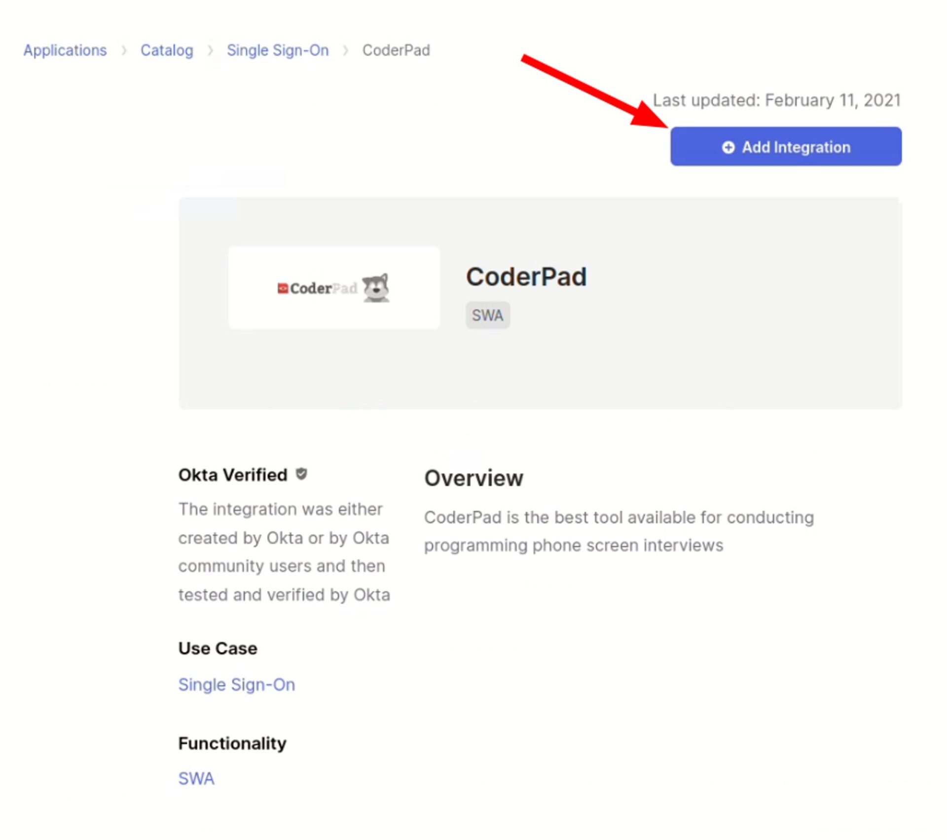 2. On the App Integration Catalog page, search for CoderPad and select the one with the “SWA” label.