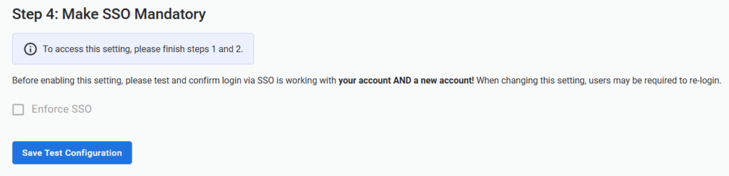 To make SSO mandatory, simply select the Enforce SSO checkbox in the step 4 section.