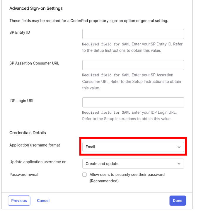 6. In the Advanced Sign-on Settings, fill in the SP Entity ID, SP Assertion Consumer URL, and IDP Login URL you obtained from CoderPad. For the Application username format field, there are two options: