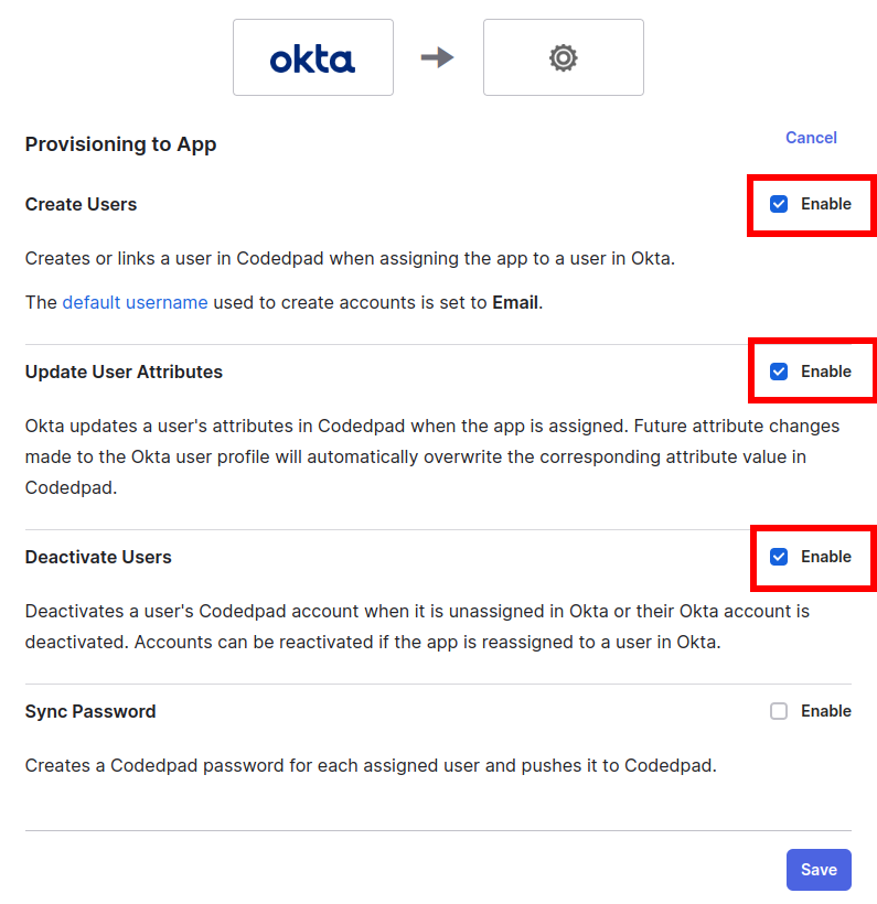 6. Check Create Users, Update User Attributes, Deactivate Users.