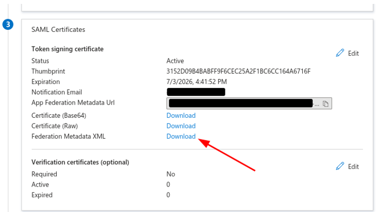 7. On the SAML Certificates section, download the Federation Metadata XML file.