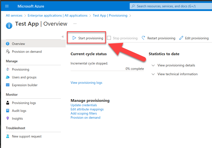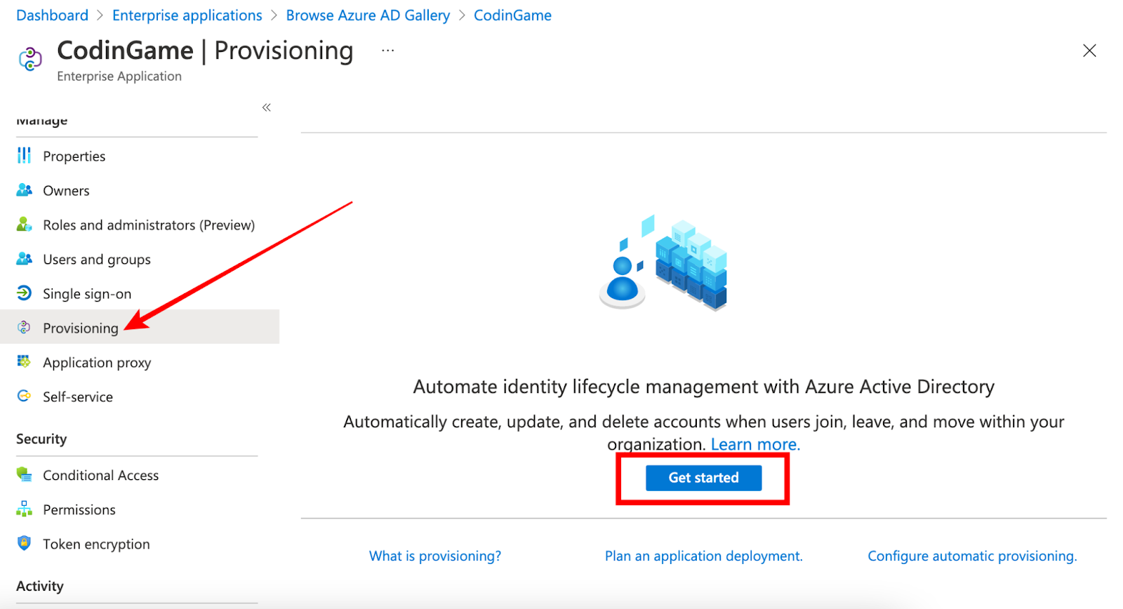 1. From the Azure AD application, select Provisioning and then Get started: