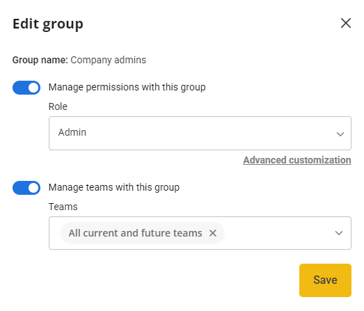 Groups can manage both permissions and teams (when using the team workspace feature). When you enable the “synchronize user access based on their groups” toggle, users’ access is automatically updated according to the definitions of their assigned groups.