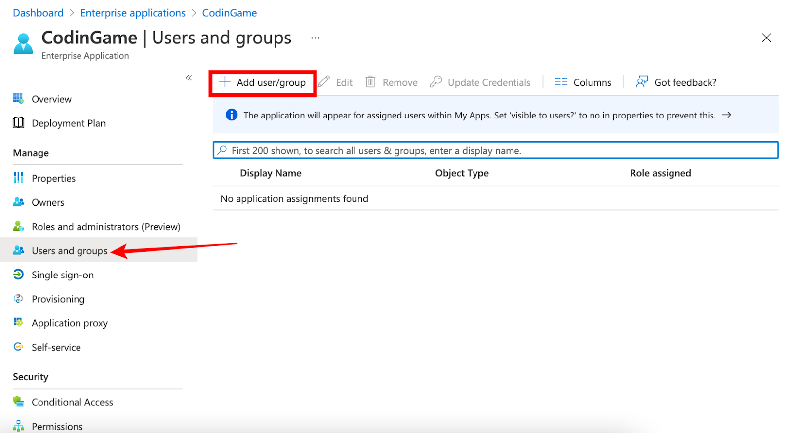 6. Add users and groups to the application: