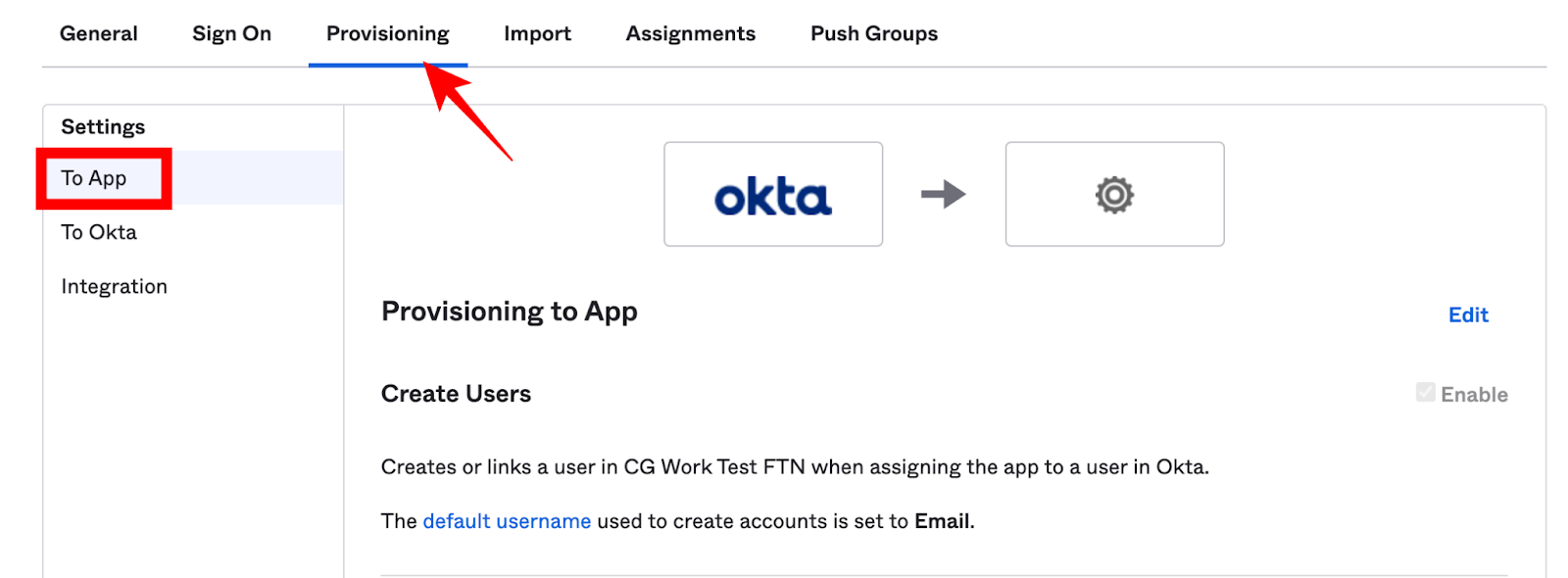 5. Now it’s time to edit the provisioning. Navigate to Provisioning > To App and select Edit: