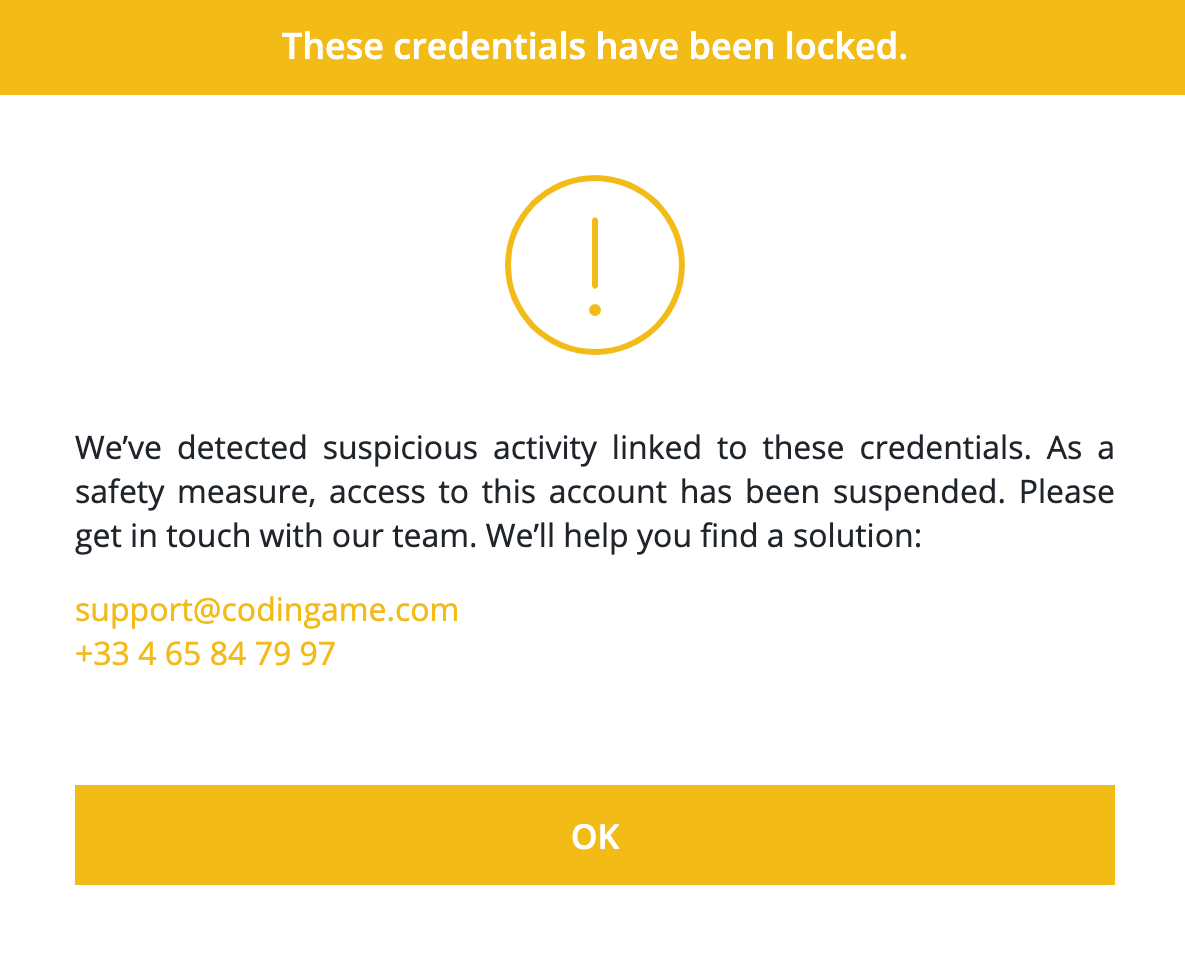If you’re logged into your account and another user simultaneously attempts to access our platform using your credentials, you’ll automatically be logged out. This will trigger the alert shown above and lock your account.