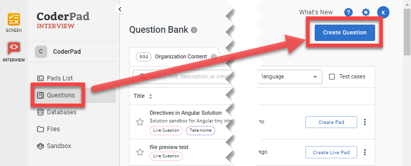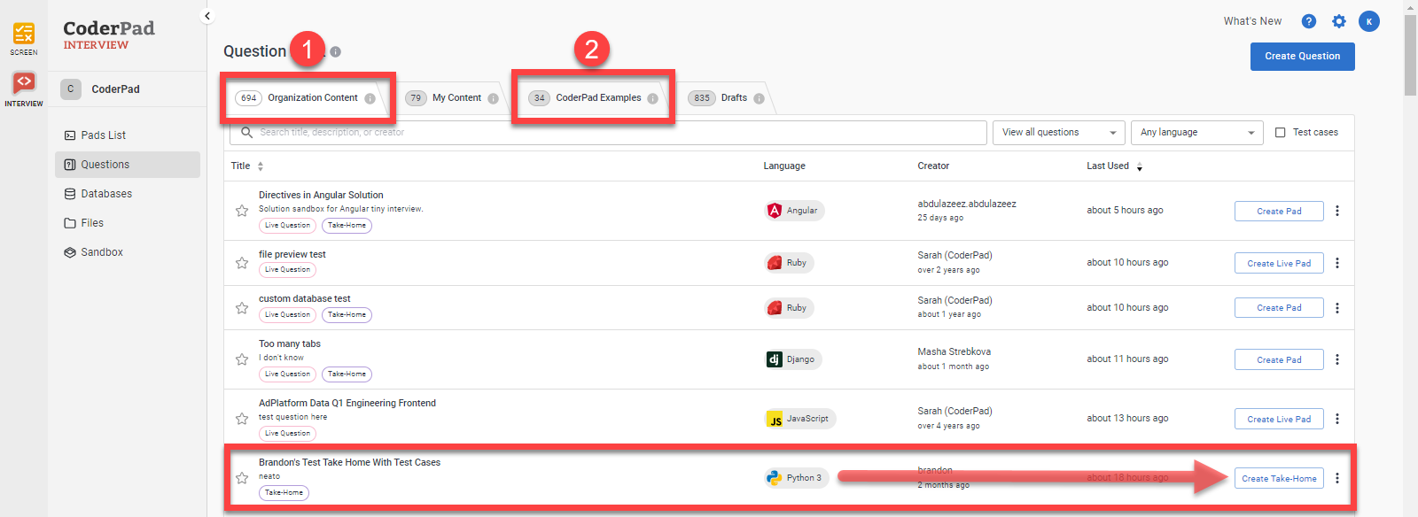 - To create a take-home test from an existing question, select a question from either 1) your company under Organization Content or from 2) Interview’s example list under CoderPad Examples and then select Create Take-Home.