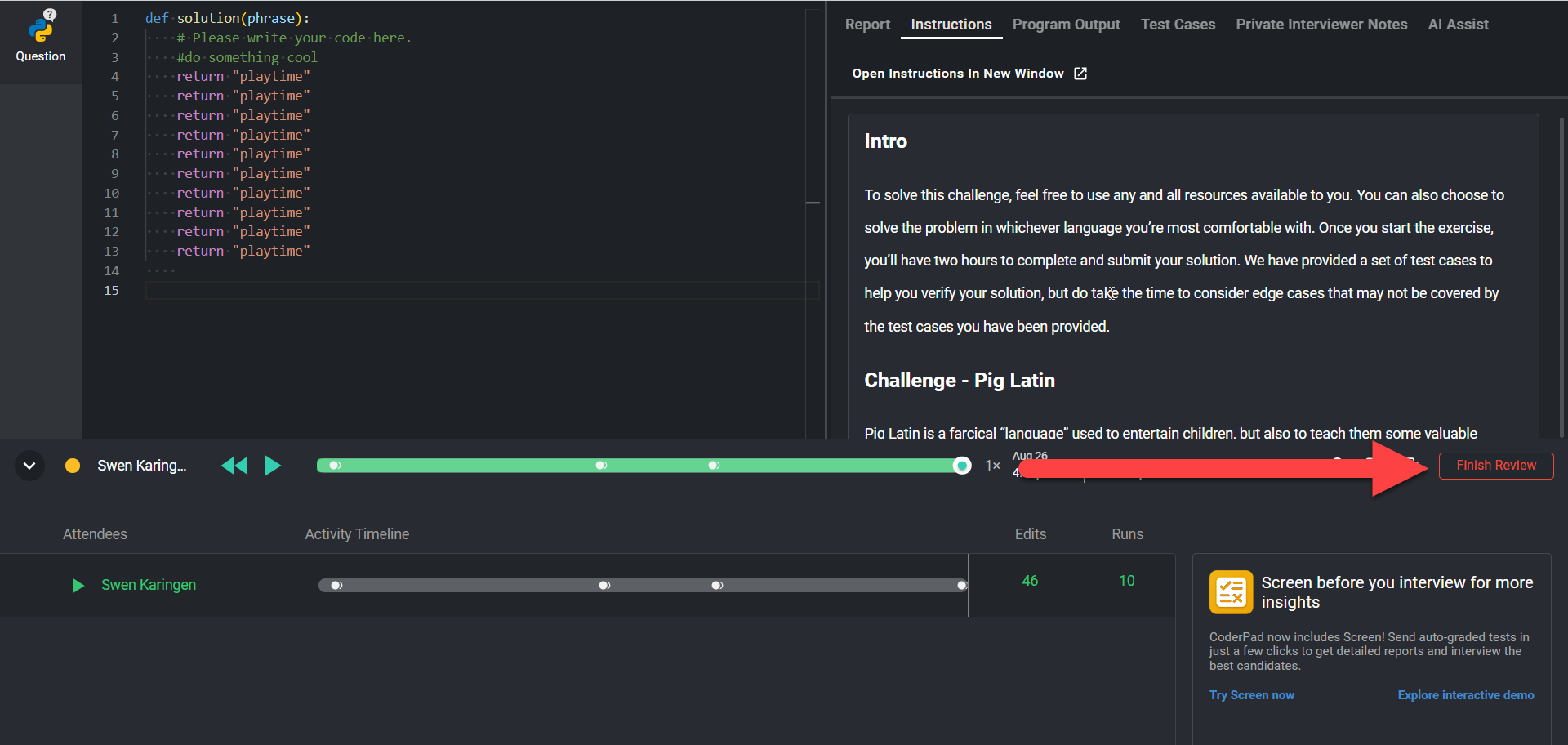 A pad is a session where the candidate and interviewer write and run code – either during a live collaborative interview or a take-home project. Interview saves a record of everything for your team to review and share afterwards.